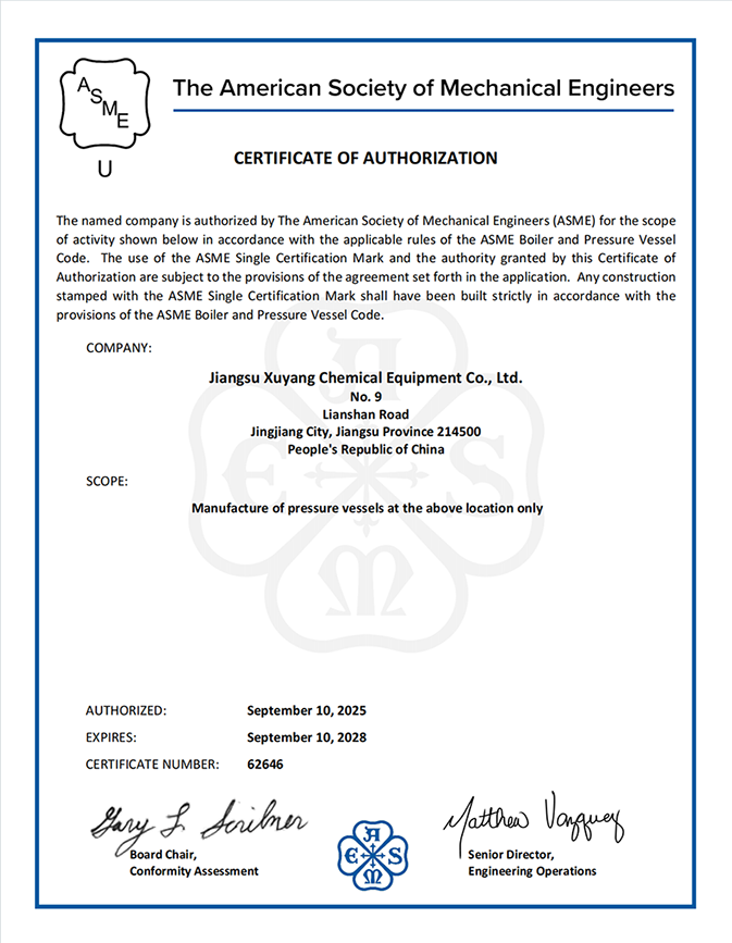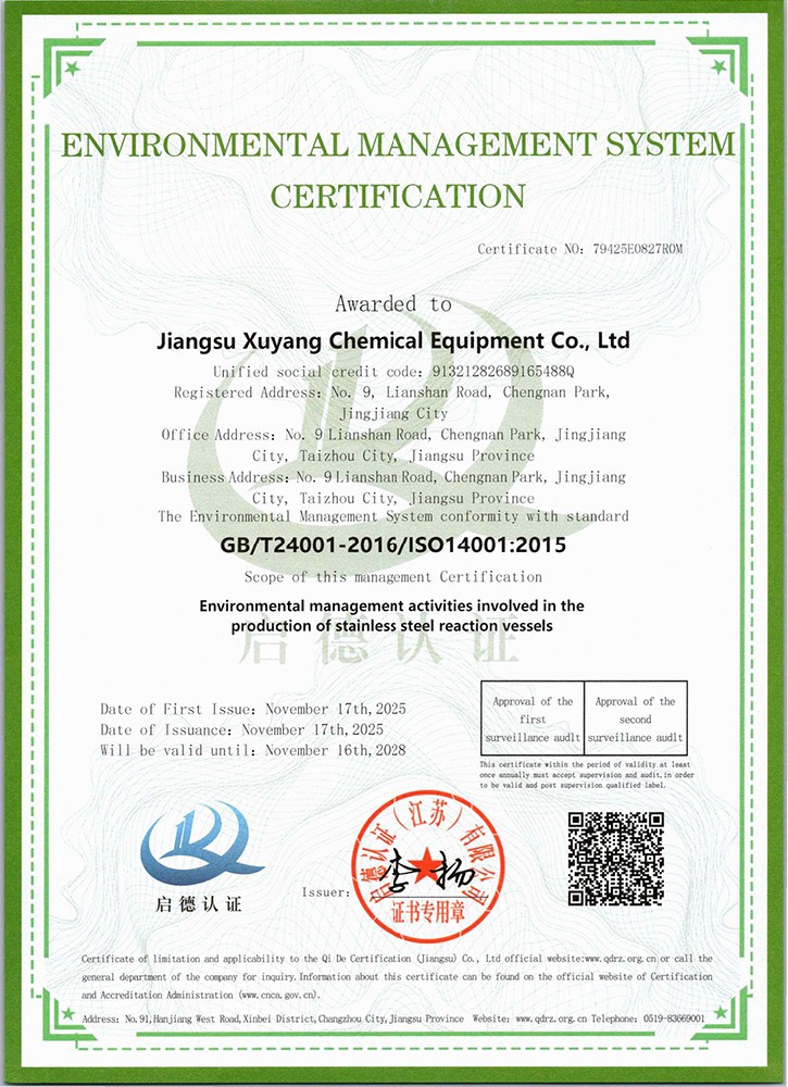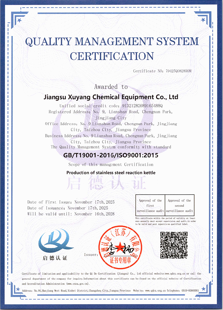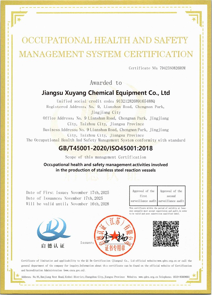 Jiangsu Xuyang Chemical Equipment Co., Ltd. is a high-tech enterprise integrating research and development, production and import and export trade, specializing in the design and manufacture of various chemical, environmental protection, pharmaceutical, fermentation, food, new materials, lithium and other projects and the manufacture of pressure vessels.